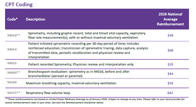 There are several CPT codes clinics can use to apply for reimbursement in the US: 94010, 94014, 94016, 94060, 94200, 94375. Below is a table describing each of the codes that can be billed for spirometry and the estimated reimbursement, based on United States Medicare Average as of January 2026.