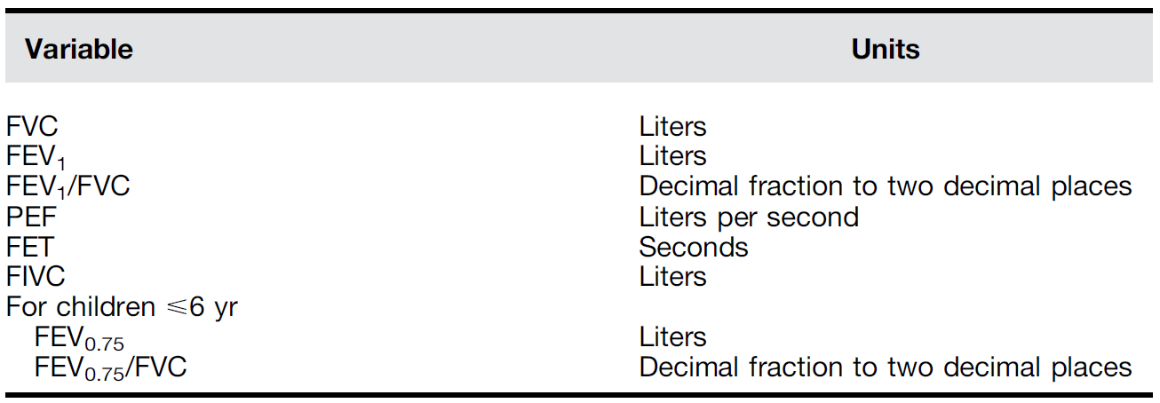 Für die Spirometer -Tests sollte das standardisierte ATS Berichtsformular (publiziert 2017) als Vorlage benutzt werden.