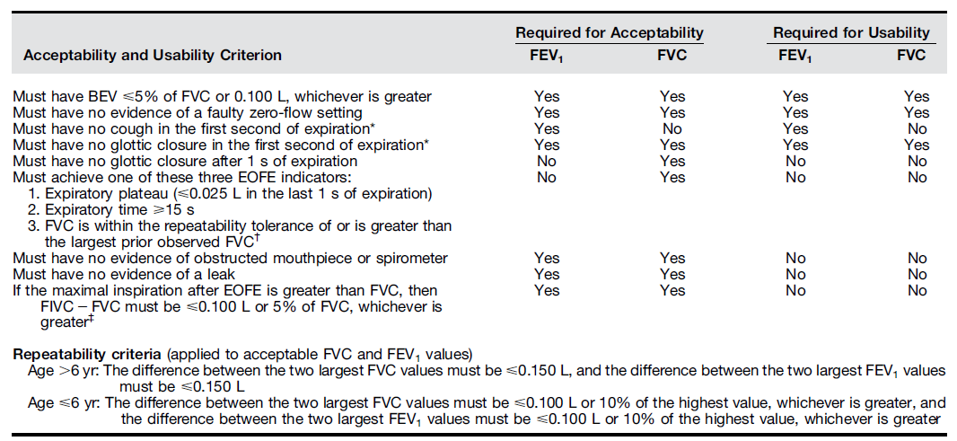 Before we dive into the newly proposed quality grading system, it is helpful to understand that, first of all, FVC and FEV1 are separately evaluated. Secondly, the set of quality criteria that an acceptable FEV1 and an FVC measurement needs to observe is also different. With the new standard, the term Usability is introduced alongside Acceptability to determine compliance with those quality criteria.