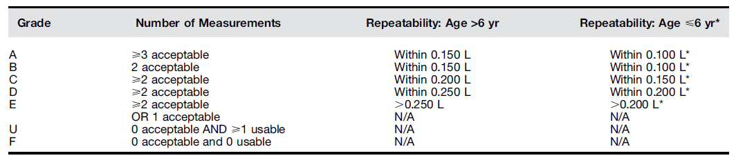 The definitions of grade A to F defined in the 2019 spirometry standard are aligned with those stated in the 2017 ATS PFT report standard. Between grade E and F we now have grade U, which means that there is 0 acceptable measurement but at least one usable measurement.