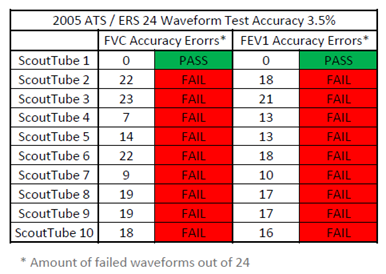 - Hans Rudolph tested 10 ScoutTubes, but only one (1) of the ScoutTubes passed the 24 waveform test according to the 2005 ATS /ERS guidelines. 9 out of 10 ScoutTubes failed the test (please see chart below). Please also note that the test result variability between different ScoutTubes in the sample is quite large.