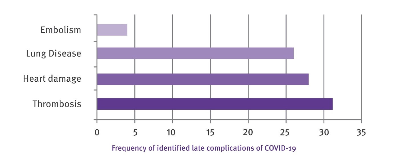 The high number of COVID-19 cases worldwide has resulted in a large population of survivors with prolonged post infection symptoms. The table below shows the frequency of the most common late complications. Notably, lung disease is the most common long-term complication reported.3